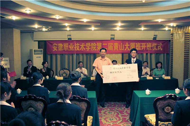 518下午,安徽职业技术学院第二届黄山大厦班开班仪式在黄山大厦城市酒店隆重召开。安徽职业技术学院院长陈传海率管理系领导,省农垦集团副总经理、黄山大厦酒店投资发展有限公司总经理陈仁虎及黄山大厦酒店管理公司相关负责人出席仪式。陈仁虎和陈传海先后作讲话并为开班仪式揭牌。黄山大厦酒店管理公司董事长王健颁发了第一笔助学金。