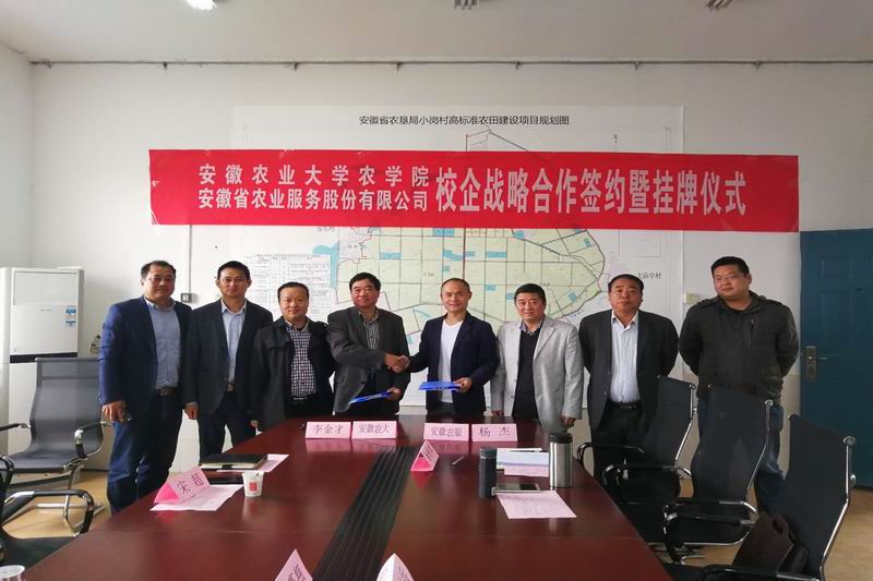 1025,安徽省农业服务股份有限公司与安徽农业大学农学院校企战略合作签约暨挂牌仪式在农垦小岗公司举行。安徽农大农学院院长李金才、党委副书记鄢高翔,省农服公司党支部书记胡兴兵、总经理杨杰、副总经理褚德军等双方领导出席签约活动。
