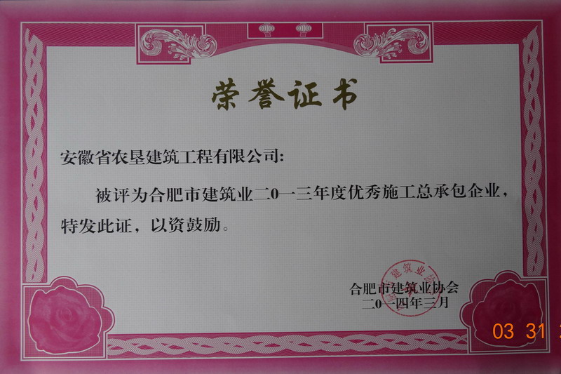 328下午,合肥市建筑业协会举行常务理事会暨理事大会,表彰了2013年度全市建筑行业优秀企业及单项先进。垦建公司获评优秀施工总承包企业统计管理先进企业两项殊荣,项目经理苏芳芳荣膺安全管理先进个人。
