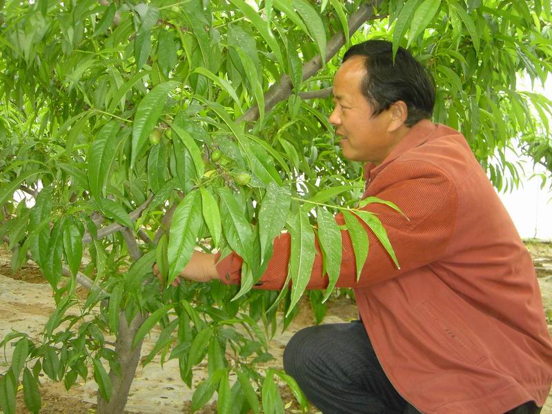 大棚内,一分场技术员孟凡富正在指导职工管理大棚水果的技术,孟凡富是砀山果园场一分场设施大棚园建设的带头人,是高效农业的实践者,也是推动者。自2003年以来,他带领一分场部分职工发展大棚杏,通过积极地探索,大棚杏生产和管理取得了成功的经验,获得了显著的经济效益,并总结出一套完整的大棚生产和管理技术。设施大棚的发展关键要靠技术支撑,果园场高度重视,除建棚实行扶持政策外,还举办设施大棚栽培技术培训班,作为分场技术员的孟凡富负责现场指导。由于技术传授给职工,设施大棚技术培训到园,技术难题解决在园内,广大职工管理大棚水果得心应手,大棚的罩棚、放风、卷毡及果树的授粉、施肥、修剪、植保等一系列生产管理措施都按部就班实施。天道酬勤,2010年,砀山果园场一分场18眼大棚水果坐果率高、果品质量好,据孟技术员介绍,今年每个棚预计比去年增产1020%,为丰收打下了坚实的基础。