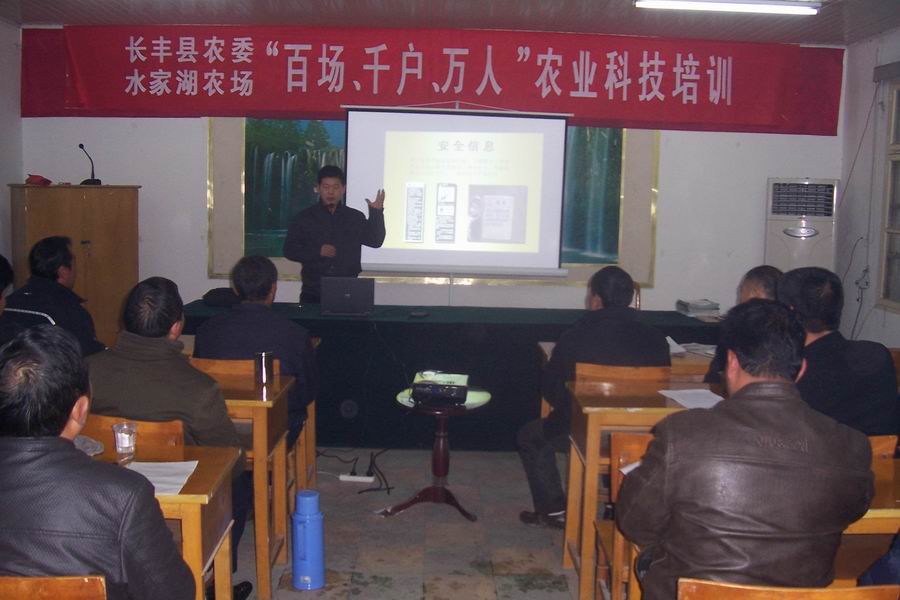 1215日上午,在水家湖农场场部会议室,农场与长丰县农委共同组织“百场、千户、万人”农业科技培训,省兴科农垦农机公司经理徐洪章和约翰迪尔佳联华东地区销售经理于兴州,给农场职工和农机局的同志们,细致讲解了农机的使用、保养、农机具购置补贴和生产实践中遇到问题的解决。