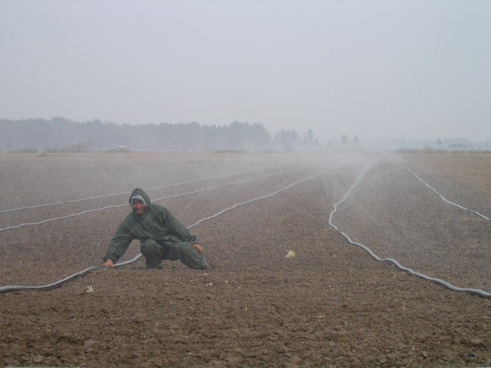 10月18日下午,潘村湖农场第一管理区职工倪景胜正在承包田里进行微喷作业。
