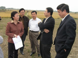 省农垦集团公司副总经理刘超在集团公司有关部门 负责同志的陪同下于10月20日在潘村湖农场就农场 城镇化建设工作进行调研.刘总一行在农场领导班 子的陪同下,实地查看了即将实施淮河行蓄洪区潘 村洼潘村湖农场移民迁建项目工程现场,听取了农 场负责同志的工作汇报.刘总对潘村湖农场扎实做 好项目建设前期基础性工作给予了充分肯定,指出: 潘村湖农场要把握实施移民迁建工程这一难得的发 展机遇,深入细致地抓好各个环节的工作,努力打造 让群众满意、领导满意、不留遗憾,在安徽农垦系 统城镇化建设中独领风骚的精品工程,让党和政府 对行蓄洪区人民的温暖惠及农垦子孙后代。图为刘 超副总经理(右二)在听取有关同志的工作汇报。 (杨登宏摄)
