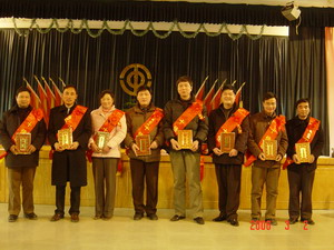 为了大力表彰在竞赛活动中涌现出来的先进集体和 先进个人,推广典型,弘扬先进,营造“崇尚先 进、学习先进、争当先进”的良好氛围。在3月2日 召开的七届一次职代会上,大圹圩农场举行了隆重 的表彰颁奖仪式,场领导们为获得最佳经济效益荣 誉称号的农技服务推广中心、获得经济效益先进单 位荣誉称号的七分场、五分场颁发了获奖证书;为 当选为“十佳职工”的于正传、刘延、陈开忠、林 爱莲、程启珍、马春连、王兵、孟凡东、薛卫军、 李方勤等十位同志披挂了绶带,佩戴了光荣花。会 议号召全场干部职工以先进为榜样,立足岗位,奋 发有为,在农场“三个文明”竞赛活动中建功立 业。(图为受表彰的“十佳职工”合影)
